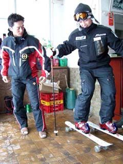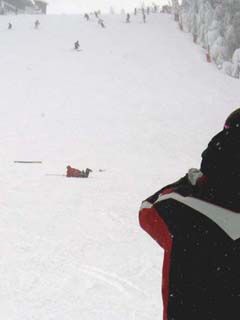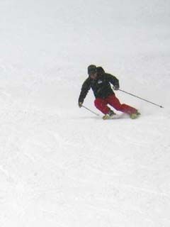 合宿初日の1班のテーマは大回り系。 板が回ろうとする動きを妨げないように、骨盤の向きを板に合わせて回して行くことが必要なのだそうで、ストックを腰にあてて滑ることで向きを確認します。 さらに股関節の可動域を有効に使うための骨盤を立てる姿勢をとるために、お尻をあげる(シッポを立てる?)ことが重要なようだそうです・・・。