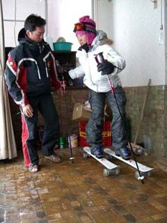 | 昼食後、中村さんが持参して下さった 『いかに自分ができていないかが分かるマシーン』を使って、腰の内向がいかにできていないかを玄関で体感。 写真はほーほー。 |