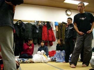 夕食後のミーティングにて畳の上でイメトレ。 脚の付け根あたりを水平チョップして、圧をかけた脚の股関節を開放させる練習。