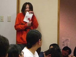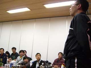 | 夜7時半、検定の合格発表と懇親会が始まりました。 まず初めに検定の合格発表が行われます。緊張感で静まり返った雰囲気の中、検定員のしむしむから総評が述べられました。 |