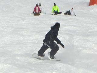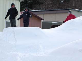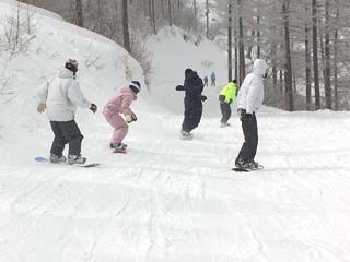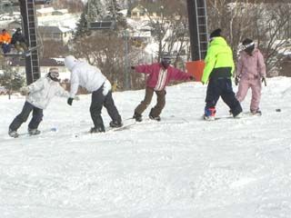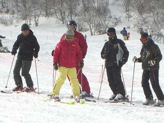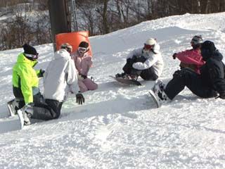 | 午後、私じょんは広報担当およびカメラマンとして「なんちゃってスノボー部」の方へ合流。 外部講師の先生(中央の黄色いウエアの人)をお招きして、講習形式で活動していました。 ヘルメット姿の◎ちゃんと直チャンがつねにSPのように張り付いています。 |