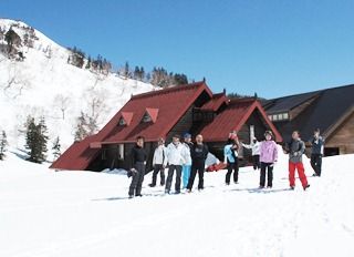 スキー場最上部からさらにロープウェイで登った山岳エリアにある栂池自然公園の雪に埋もれた栂池ヒュッテです。 スキーを担いで10分歩いただけで汗だくでした。